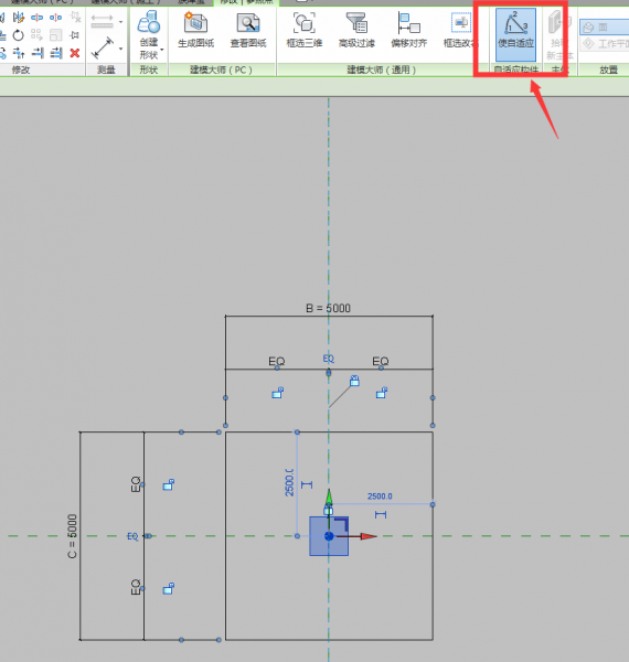 3、放置一個”點圖元”在中心,并使其自適應,并把“自適應點”鎖定在中心上,如圖所示。