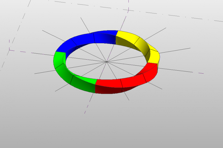 9、依照上述步驟,生成莫比烏斯環其余部分,并分別設置黃、藍、綠色,一個完整的莫比烏斯環便完成了,如圖所示。