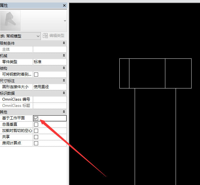 02、在創(chuàng)建族時(shí),屬性菜單中取消勾選“總是垂直”,勾選“基于工作平面”,然后重新載入到項(xiàng)目中,如圖所示。