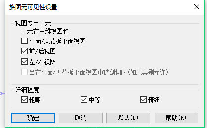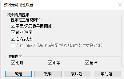 03、確認族里構件的實體模型在所選視圖“精度”中是否可見,以及對應的“視圖類型”(平、立面等)是否可見,設置結果如圖所示。