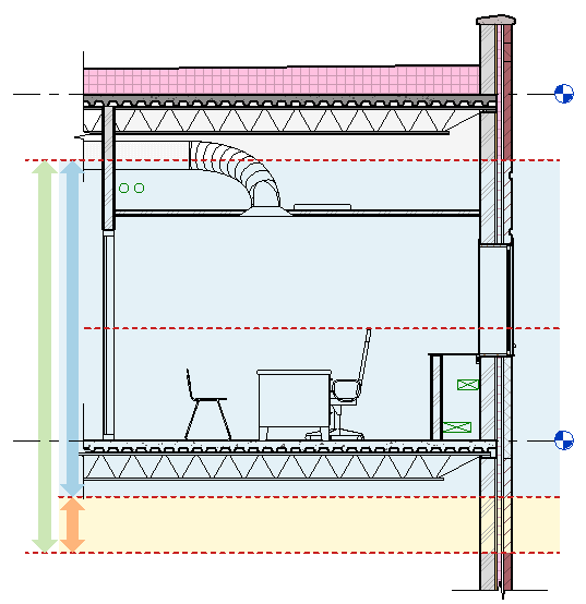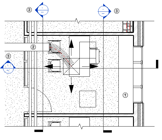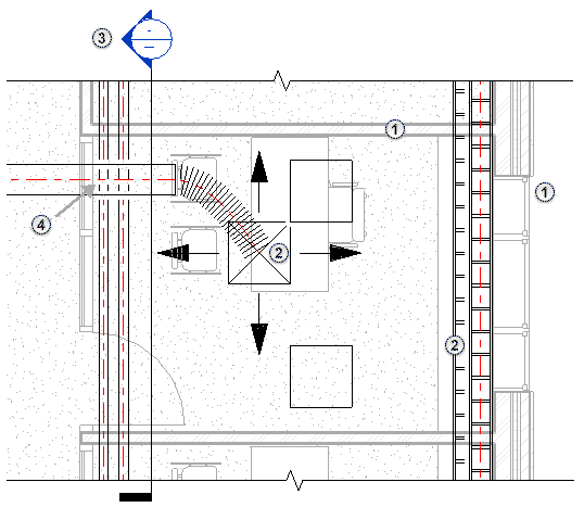 下面的示例基于一個模型的標高 1 剖面平面。 在該剖面平面中,綠色箭頭指示對應平面視圖的整個視圖范圍。 藍色箭頭指示主視圖范圍,該范圍已擴展到高于天花板進入正壓送風系統,并低于標高 1。 橙色箭頭指示視圖深度。 (請參見關于視圖范圍。) 在下面示例平面視圖中,“詳細程度”被設置為“精細”,以便更充分地顯示機械、電氣和管道圖元,從而方便說明。