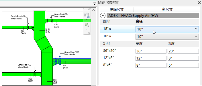 在“MEP 預制構件”選項板中,根據需要指定新尺寸。
