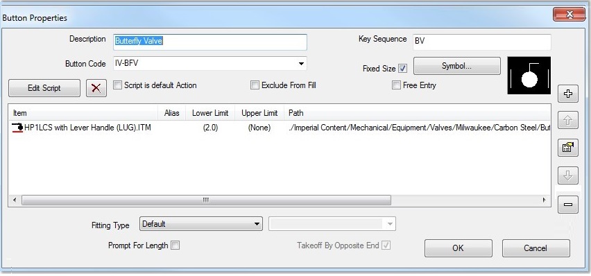此時會顯示“按鈕屬性”對話框。在以下示例中,蝶閥構件的按鈕代碼是 IV-BFV。