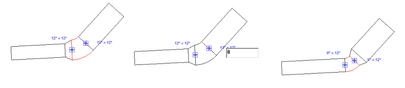 對于矩形和橢圓形風管,必須分別輸入寬度和高度尺寸控制柄的值。在下圖中,矩形彎頭管件的尺寸從 12" x 12" 調整為 8" x 12"。