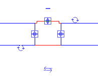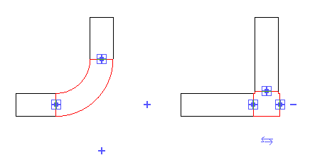 該管件旁邊會出現藍色的風管管件控制柄。 如果所有可用的連接件都在使用中,其他可能的支架會被標記上加號。 未使用的支架帶有減號,表示可以刪除該支架以使管件降級。