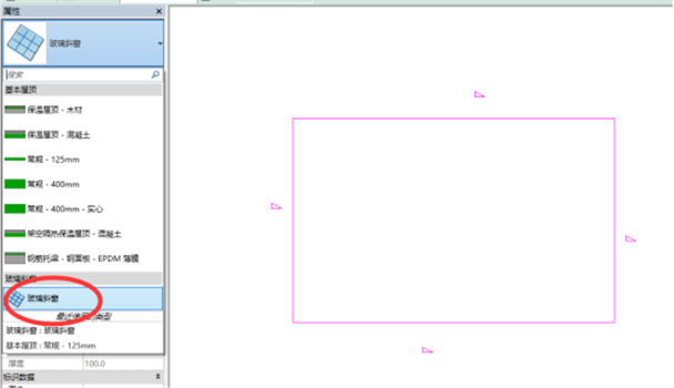 2、新建一個項目,在項目中使用跡線屋頂繪制出一個矩形坡屋頂,并將屬性改為玻璃斜窗,如圖所示。