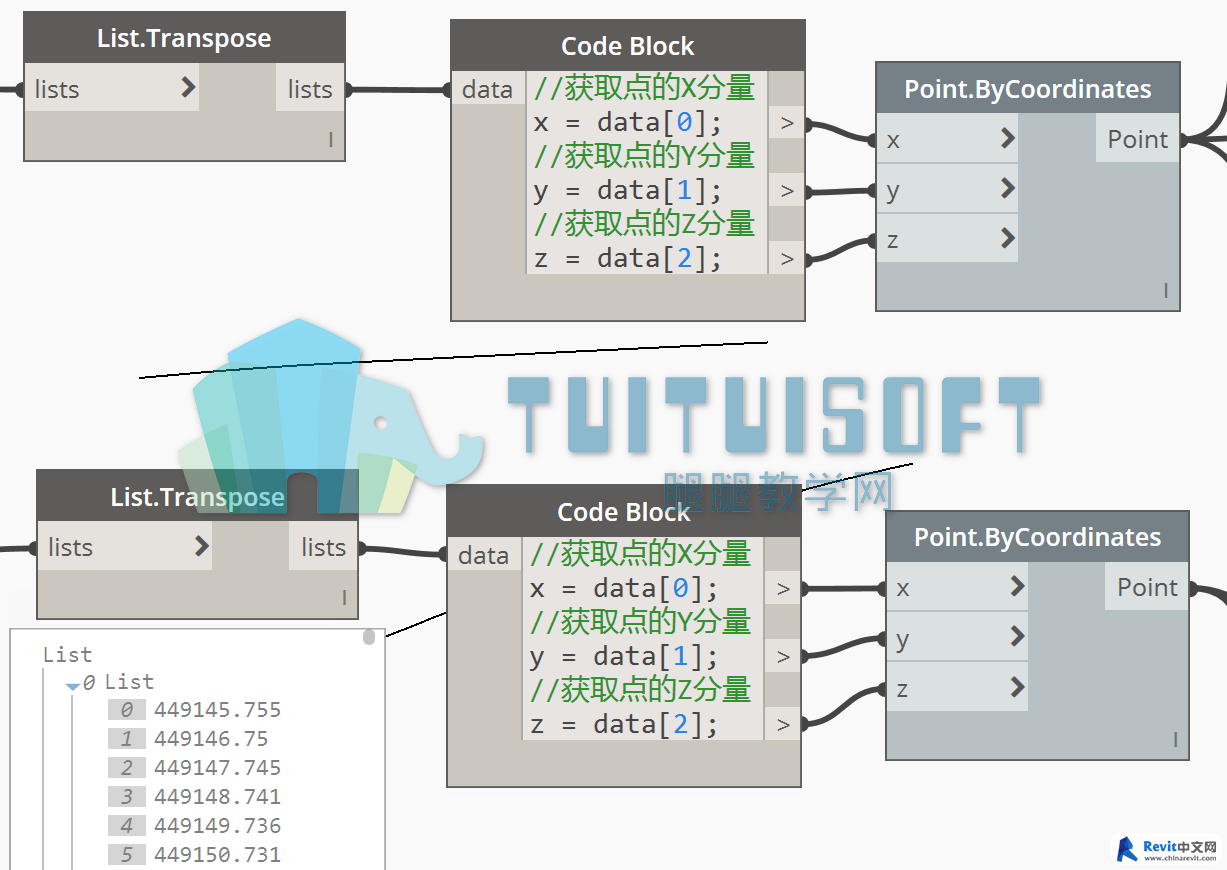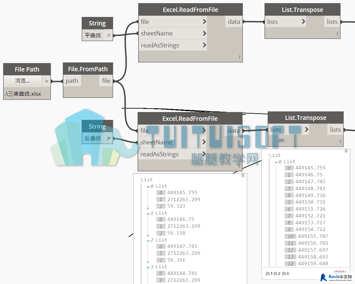 本文中假設(shè)給定了點的坐標(biāo),通過節(jié)點Excel.ReadFromFile將表格的數(shù)據(jù)導(dǎo)入,節(jié)點List.Transpose將結(jié)果轉(zhuǎn)置。