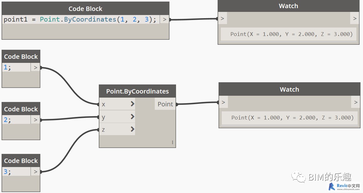 Code Block 可以執行大部分節點命令,好處也是使用起來非常的方便。比如Point.ByCoordinates節點,要做一個點,除了用到Point.ByCoordinates節點外,還要單獨做三個數值輸入節點,相對來說比較麻煩,而用 Code Block 節點就可以比較方便的生成點,如下圖所示: