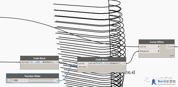 如果選擇現(xiàn)在生成得曲線放樣,我們可以生產(chǎn)一個(gè)垂直幕墻,這里就不再贅述,我們這里假設(shè)幕墻是按照正弦函數(shù)變化, 形成中間部分部分輪廓大的效果,需要對剛才生成得每層的曲線,向外偏移,實(shí)現(xiàn)如下效果: