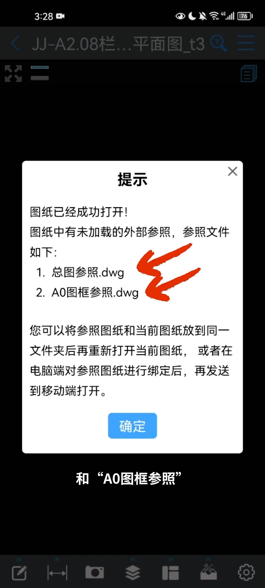 情況及原因:CAD快速看圖打開圖紙時,軟件提示有外部參照,并且在提示中會顯示參照文件名稱,可以看到打開這張圖紙時需要加載的外部參照有“1.總圖參照.dwg”和“A0圖框參照.dwg”
