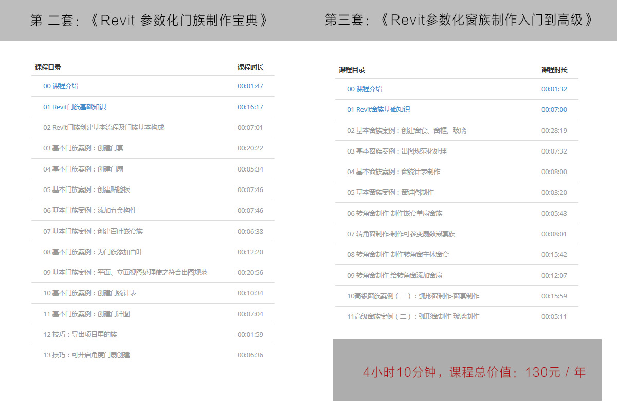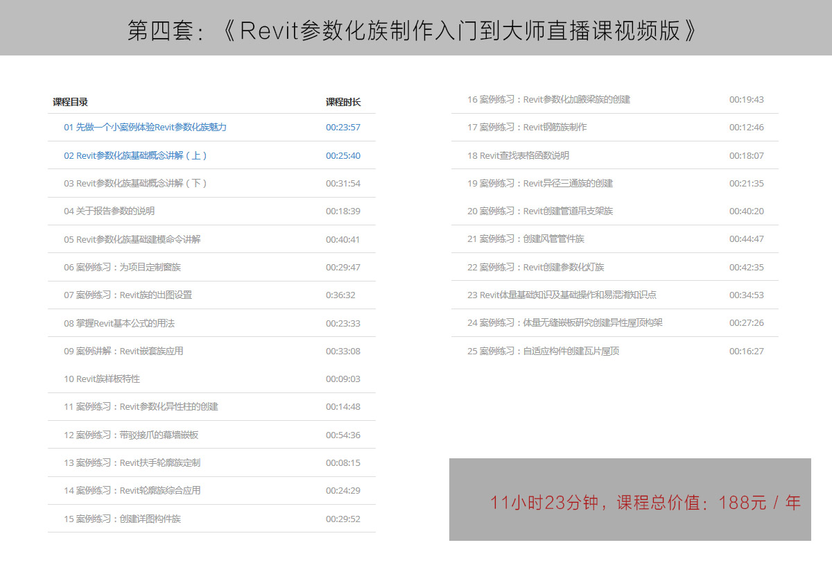 《Revit參數化族制作入門到大師》 課程原價:188元/年,課程時長:11:23:45
