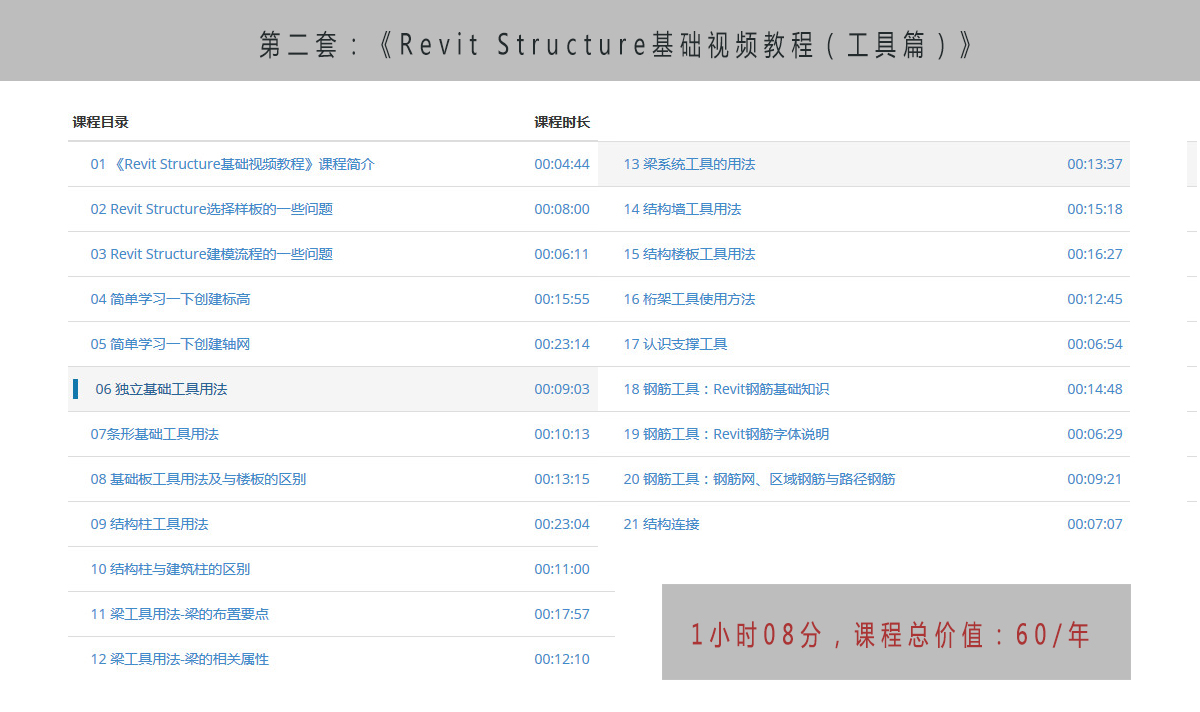 Revit Structure基礎視頻教程(工具篇)》 課程原價:60/年,課程時長:01:08:22