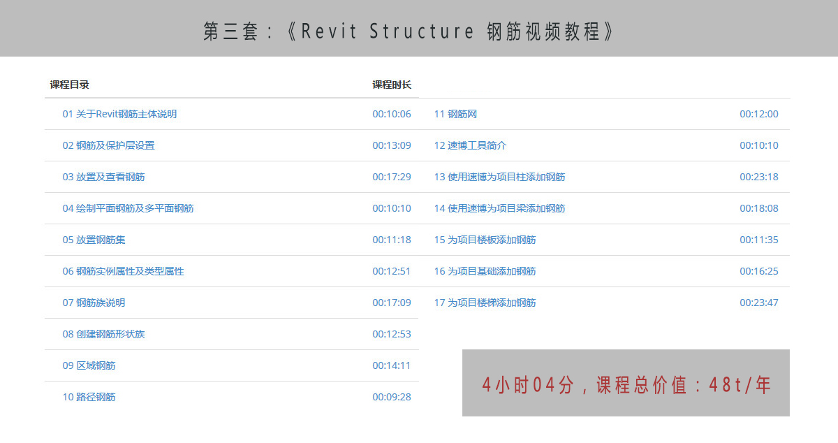 Revit Structure 鋼筋視頻教程》 課程原價:48/年,課程時長:04:04:15