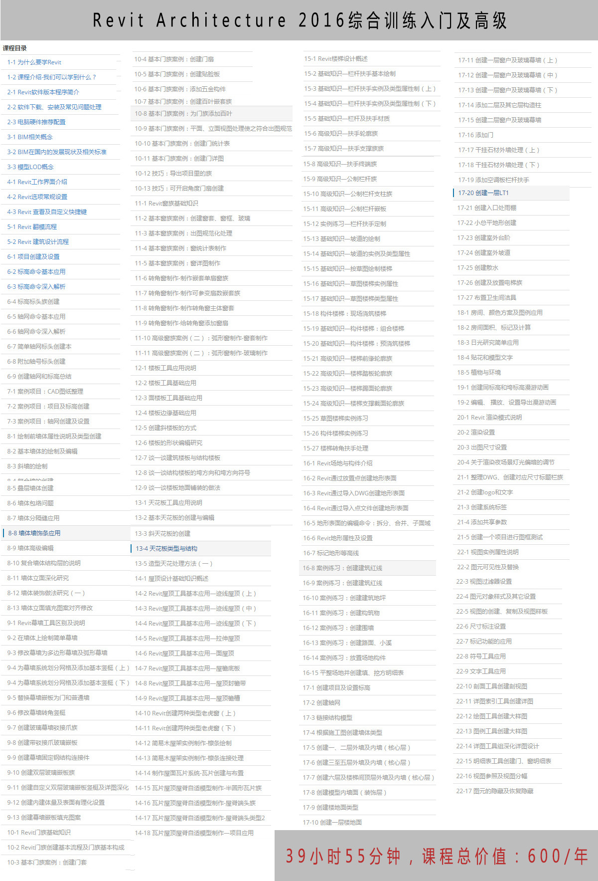 Revit Architecture 2016綜合訓練入門及高級》 課程原價:600/年,課程時長:39:55:00